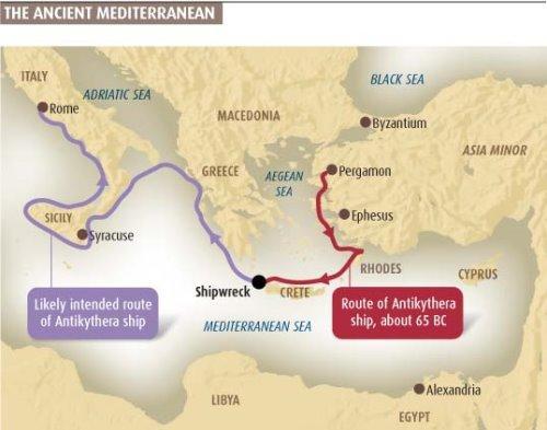 1900年复活节期间,一群希腊海绵捕捞者由北非近海的传统渔场返回罗得岛附近的家乡瑟梅岛,途中忽然遭到风暴的袭击。他们被吹得偏离了航线,后来终于在克里特岛西北岩石遍布、几乎无人居住的小岛安提基特拉觅得避风的场所。他们想捞些海绵,却在无意之中惊奇地发现了一艘大船的遗骸。在这些渔民看来,这艘古代沉船尽管装有许多货物,但最吸引人的物品却是一大堆青铜和大理石雕像。他们向当局报告了这一发现,并于11月,同几位考古顾问一道返回安提基特拉。清理沉船的工作一直延续到1901年9月。在发掘完毕将近8个月之后——这些文物在水下经历了漫长的岁月,因此,清理上面的凝结物既费时又费力一一他们从这些物品中,找到了一些刻有希腊铭文的青铜碎片。不久后,又发现了一些残片。至此,一套完整的齿轮终于展现在人们面前,其中的几只齿轮还带着文字。