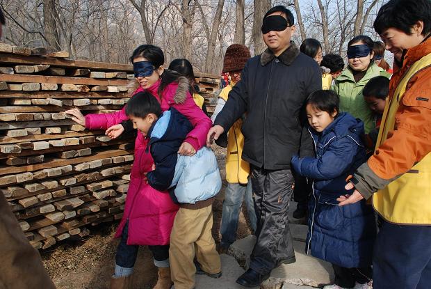 上午十点,随着第一个游戏节目活动正式开始。在这个名为“感恩的心”的亲子游戏中,爸爸或妈妈要戴上眼罩扮演盲人,而孩子们要扮演哑巴做不出声的带路人。这些七八岁的孩子们平日里尽享父母家人的悉心呵护,今天可要轮到他们来保护爸爸妈妈了。在孩子们的扶助下,“盲人”们走出了会议室,穿过楼道,下楼梯,走土坡,过窄路,上楼梯。