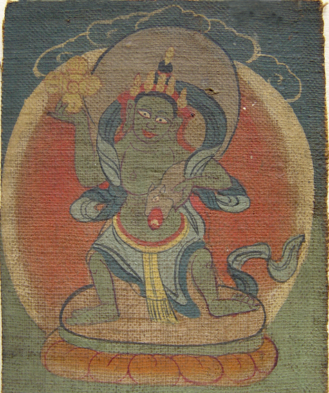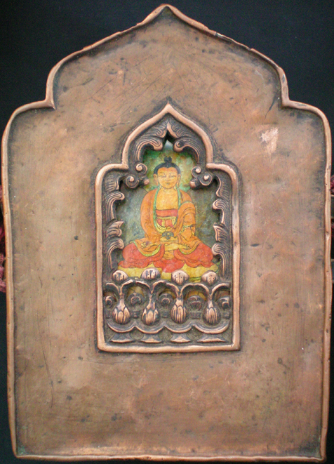 噶乌是匝尕的重要载体之一,一般用于供放十分珍贵的活佛、高僧亲手绘制或加持使用过的匝尕。噶乌,意为小盒子,也是藏族地区最为常见的佩带饰物,同样也是护身灵物。噶乌系由金、银、铜等金属打制而成,也有木制的,外形精雕细刻,美观醒目,里面装有小佛像或活佛大德的像及其他的护身物。笔者保存的一幅匝尕出自后藏日喀则,大概是由某大寺院的高僧手绘,国内仅见,十分稀有,其包含的汉藏文化交融的信息具有相当高的研究价值。