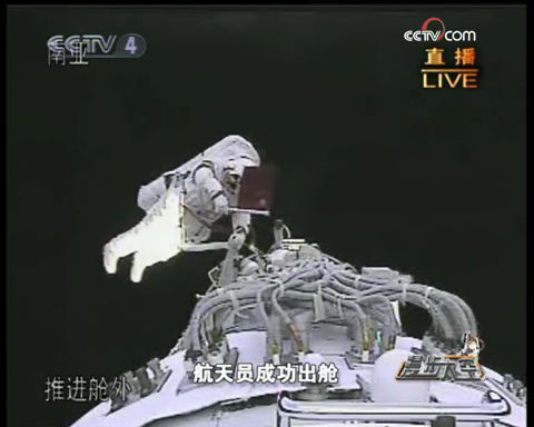 2008年9月25日,中国航天员翟志刚、刘伯明、景海鹏搭乘“神舟七号”载人飞船,在酒泉卫星发射中心通过长征二号F型火箭发射升空。9月27日16:39,身穿国产“飞天”舱外航天服的翟志刚打开舱门,执行我国首次太空出舱任务,成功取回放置在舱外的试验品。9月28日傍晚,神舟七号返回舱在内蒙古主着陆场成功着陆,中国第三次载人航天任务圆满完成。