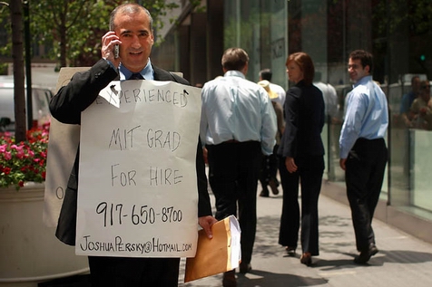 图为失业的金融工程师约书亚·佩斯基(Joshua Persky)今年6月24日站在纽约第50大街和公园大道(Park Avenue)上,身上挂着标语牌。佩斯基在年初失去了银行业的一份工作。雷曼的破产和贝尔斯登的出售导致华尔街裁掉了数千个职位。