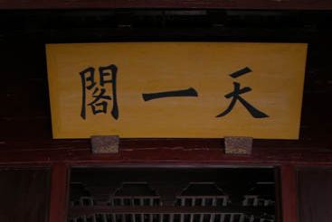 天一阁之名,取义于汉郑玄《易经注》中“天一生水”之说,因为火是藏书楼最大的祸患,而“天一生水”,可以以水克火,所以取名“天一阁”。书阁是硬山顶重楼式,面阔、进深各有六间,前后有长廊相互沟通。楼前有“天一池”,引水入池,蓄水以防火。康熙四年(公元1665年),范钦的重孙范文光又绕池叠砌假山、修亭建桥、种花植草,使整个的楼阁及其周围初具江南私家园林的风貌。