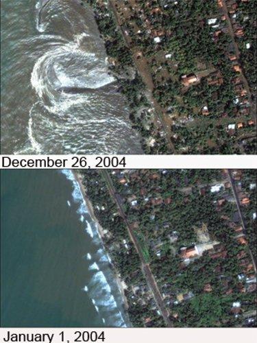 2004年12月26日,即印度洋地震引发的大海啸第一波冲击斯里兰卡海岸后1小时左右,卫星从太空捕捉到的这次灾难的照片。下面的照片则则是大海啸之前斯里兰卡海岸的景象。