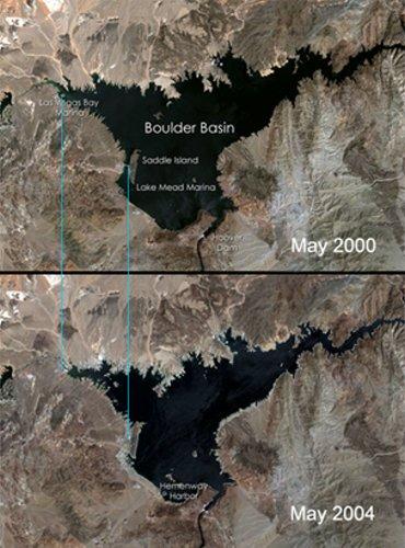 世界最大水库之一美国米德湖的卫星照片,照片显示米德湖水位在大约4年内急剧下降。该地区严重干旱甚至让一些专家作出了看似危言耸听的预测:米德湖在2021年将彻底干涸。