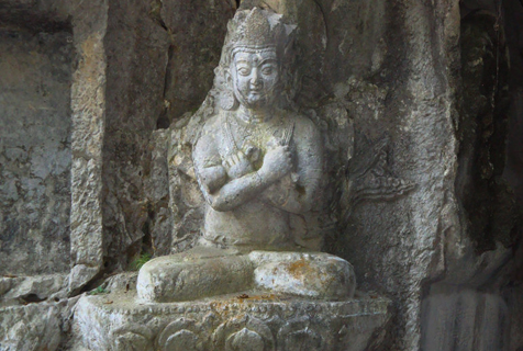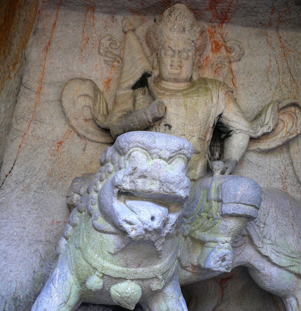 规模最为宏伟的属呼猿洞第70龛释迦三尊,本尊通座高3.6米,左胁侍普贤菩萨持莲,右胁侍文殊菩萨执剑。“欢喜佛”是喇嘛教艺术所独有的,飞来峰一线天洞口第25龛之“欢喜佛”(应称秘单身结跏趺坐的菩萨形,像高约1.4米,右手握金刚杵,左手握金刚铃,结金刚印。著冠,面带喜色。)