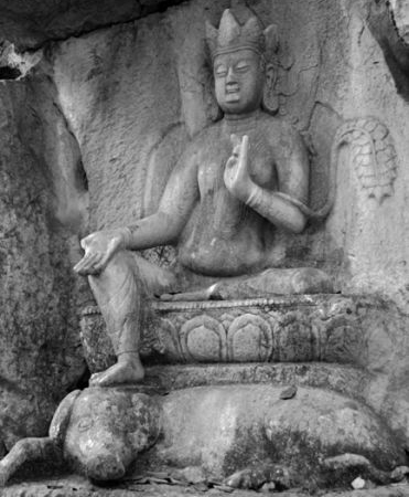 一线天洞口第23龛普贤菩萨,头戴五佛冠,背倚月轮,坐白莲花,右手持金刚杵安于心上,左手执般若波罗蜜金刚铃安胯上。高约1.5米,比例适度,姿态自然。
