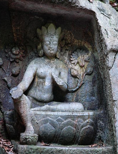 飞来峰梵式造像中,菩萨形象更为丰富,数量居第二位,共十一尊。喇嘛教的菩萨形象多为多面广臂的式样。飞来峰第15、36、64龛均为四臂观音像,前二手合掌,后左手持莲,后右手执数珠。
