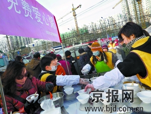 今儿个是农历腊月初八,俗称“腊八”。一大早儿,宣武区红莲小区的仁爱心栈免费粥铺里挤满了前来喝粥的居民。上午9点,十几位义工将两大桶香味儿四溢的腊八粥装上特制的小推车,来到42路公交车站,为这里的司售人员和候车市民送上一碗热气腾腾的香粥。