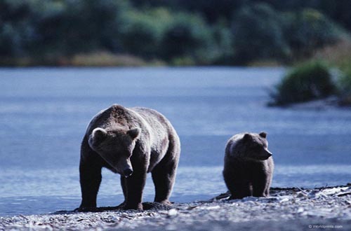 兩头小熊在一起打打闹闹, 又追赶螃蟹, 不觉离开熊妈妈有二十几米了, 其中一头大概突然感到了某种不安, 急忙向熊妈妈那里跑了回去.另一头像是个胆大的家伙, 它滿不在乎地沿着那里的河边搜寻着.见到這情景, 我激动得心儿怦怦直跳.