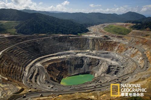开矿大军的顶层则是世界上最大的采矿公司经营的大型露天金矿。在巨型机械的帮助下,这些破坏性巨大的矿坑开采出占全球总产量四分之三的黄金。它们还创造了就业机会,带来新技术,带动了被人遗忘的边缘地带的发展。然而,开采1盎司黄金产生的废料远高于开采同等质量的其他金属,金矿原料与成品的悬殊比例揭示了其中的原因:开矿留下的巨大“疤痕”在太空中都能看到,然而从中取得的金粒却又如此之小,往往200多个金粒加起来才有针眼那么大点。即使是像纽蒙特矿业公司开在印度尼西亚东部的巴都希贾乌的示范矿,为减轻环境危害的投入达6亿美元,也无法避免开采金矿的遗害。提炼1盎司黄金——相当于一枚普通婚戒的金量——就要掘出250吨以上的岩石和矿石。
