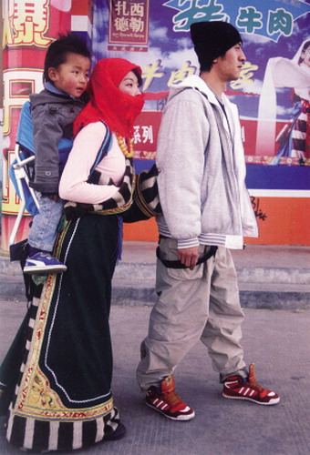 次旺扎西让活人扮演静态画面,来重现陈丹青上世纪80年代反映藏民和西藏生活的风俗画作《西藏组画》。其中,《进城》讲述的是穿着传统西藏服装的妇女和小孩,漫步在拉萨一条有汉语广告牌的街上,在她们身边是一个穿着现代“嘻哈人群”宽大便服的男青年。这种明显的文化碰撞给观众带来了视觉上的不协调,然而,它反映出的就是当代社会的一种真实。