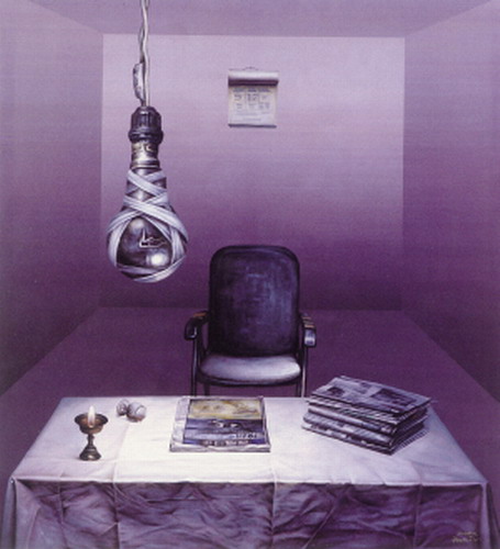 诺次以绘画语言方式,刻画出他对今年5月12日四川汶川地震的悲痛心情——桌上报道地震消息的报纸,暗示着灾难的惨烈程度与种种细节;用白色绷带包裹着的灯泡,隐喻着灾难后留下的心理创伤……通过一系列反映他感情状态的象征物,这一切都象征着这次地震灾难带给人类的黑暗与忧伤。