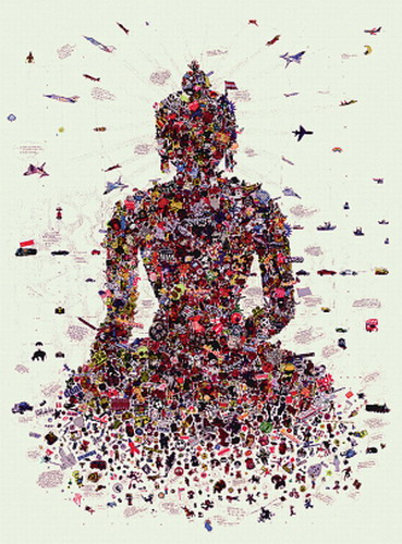 曾在拉萨、北京、伦敦及印度等地学习生活,使孔卡嘉措的作品带有明显的都市感。由国内外各种广告、企业图标、价格、卡通人物等组成的拼贴画《佛祖—释迦牟尼》,将处于两极的佛教理念与世俗商业文化联系在一起,揭示了当代社会的伪善与肤浅,将佛教教义平凡化,揭示出佛教圣谛:贪欲为众苦之本。