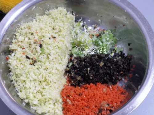 1、把材料都用刀剁碎,白菜、罗卜要控出一部分的水;