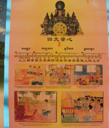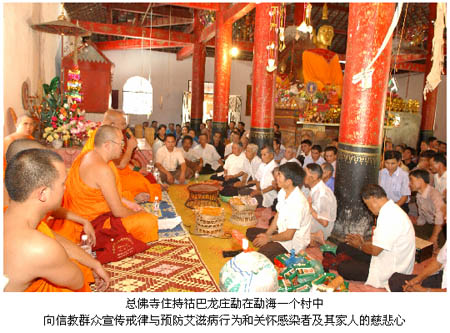 为了办好“佛光之家”,西双版纳州佛教协会和总佛寺还派僧人到泰国学习经验,了解艾滋病预防关怀的基本方法,并结合佛教“五戒”向信教群众宣传艾滋病的预防知识;除了利用佛事活动介绍艾滋病的知识,还积极培训各寺庙的住持和在佛学院上学的僧人,通过他们在各村寨进行宣传。“佛光之家”不仅融进了趣味性的说理,还巧妙地揉进了大量的佛学“四无量心”佛法禅理,渐渐使群众由当初对政府组织的艾滋病关怀因不了解而心存畏惧,转变到敢于主动前来咨询和交流,为以后关怀工作的开展打下了基础。