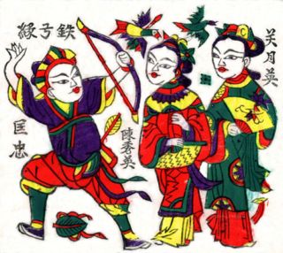古代岁终要举行大型傩仪, 驱逐旧鬼, 迎入新神。后来傩仪逐渐演变成了春节娱乐活动, 比如放鞭炮, 点灯笼, 赛社神, 再有就是贴门神, 贴春联。门神有两位, 一左一右, 一位的职责是驱逐已经失去生命力的旧鬼, 另一位的职责是迎接生气勃勃的新神。而春联则是用汉字写上除旧布新的吉语, 贴于门户两侧和门帽, 表示进门的都是吉庆春色和财气。过春节还要贴年画, 年画的内容大都是些反映民众理想和心愿, 表现欢快的生活情趣的题材, 像什么“五谷丰登” 、“六畜兴旺” 、“风调雨顺” 、“荣华富贵” 、“迎春接福” 、“连年有余” 、“松鹤延年”之类。黄河中下游是年画的主要产地, 著名的有陕西凤翔、山西临汾、河北武强、天津杨柳青、河南朱仙镇、山东潍县, 这些地区制作的年画深受欢迎, 远销全国各地。在这些地区, 有些村镇几乎“家家都会点染, 户户全善丹青” , 一家男女老少齐上阵, 会刻的刻, 善描的描, 不会刻不会描的, 就拿个颜料碟子点点涂染, 完全是一条龙作业。年画主要是作为年节装饰, 所以内容喜庆吉祥,色彩强烈浪漫, 形式红火活泼, 就构成它的基本艺术特色。年画内容在主题上总是不离福禄寿喜, 但有些题材则随时代而变化翻新, 年画是个窗口, 它既让人看到历史仍然在延续,传统照旧有活力, 也让人窥见时代的变迁, 风俗的移易, 它是中国民众心灵的镜相。不管如何变化, 那年画上的人和事, 都是中国人喜爱并向往的。