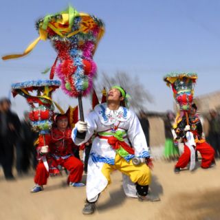 春节闹秧歌俗称“闹红火” , 人们尽情地蹦达, 雀跃, 谐谑简直是黄土地上的狂欢节远远地, 一把火红的花伞冒出了崖畔, 颤悠悠抖, 滴溜溜转,领着秧歌队过来了。打着花伞的“伞头” 左一个鹦子翻身, 右一个鲤鱼打挺, 把那花伞舞得像个飞转的风火轮, 指挥秧歌队沿门子转院一家家拜年祝福。接着, 秧歌就依次表演一番。先是跑旱船。那旱船长约尺, 用竹或林秸扎成, 饰以彩绸、纸花, 船身用布带系在表演者身上, 船下用布围住, 遮住表演者的腿脚。那跑旱船的演员多扮成一对渔家夫妇或父女, 女的在船中, 男的在船外撑篙或划浆,表演水中行船或捕鱼, 做一些以示与风浪搏斗, 船在旋涡和波浪中起伏的技巧性动作, 是社火秧歌的一种民间舞蹈然后是跑驴。“驴” 用竹、纸、布扎成前后两截, 系在扮成农村少妇的腰间, 下面用布围住。跑驴一般是表现一对农村小夫妻回娘家的路上,过沟、爬坡、驴惊、抢险等经过。扮骑驴小媳妇的女演员要以腰为中心,之一左右微微晃动身子, 下身用颤抖的小步蹭动, 模拟驴的跑、颠、跳、踢、惊、翠等动作和神态。
