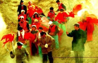 其实最威风、最阳刚之气的是扮社火“芯子” 的。这实际上是一种造型艺术。平日里土得掉渣的庄稼把式,这时候都根据古装戏中的人物造型穿戴打扮起来, 在脸上画上重重的油彩, 你替我画个红脸关公, 我替你画个黑脸张飞, 完了各自提上古代英雄的当家武器, 将平日拉车驾辕的大骡子大马挂鞍披彩, 然后纵身上马, “ 哇啦啦” 一通怪叫, 俨然英雄再世。他们在一班凡夫俗子的前呼后拥下, 威严地巡游五乡六镇, 那破锣一般又沙又哑的社火小调唱得格外来神: