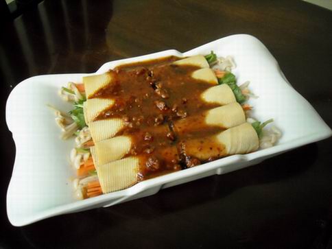 2、豆腐皮放在菜板上,将胡萝卜丝、香菜段、金针菇、素肉碎酱放在豆腐皮上卷起,卷实;