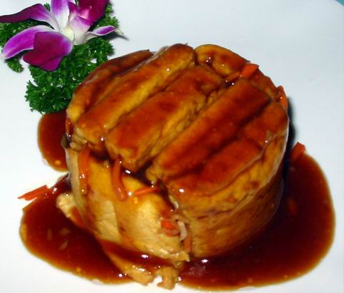9、炒锅继续上火,将汤汁用湿淀粉勾上芡,浇在全福豆腐上即成。