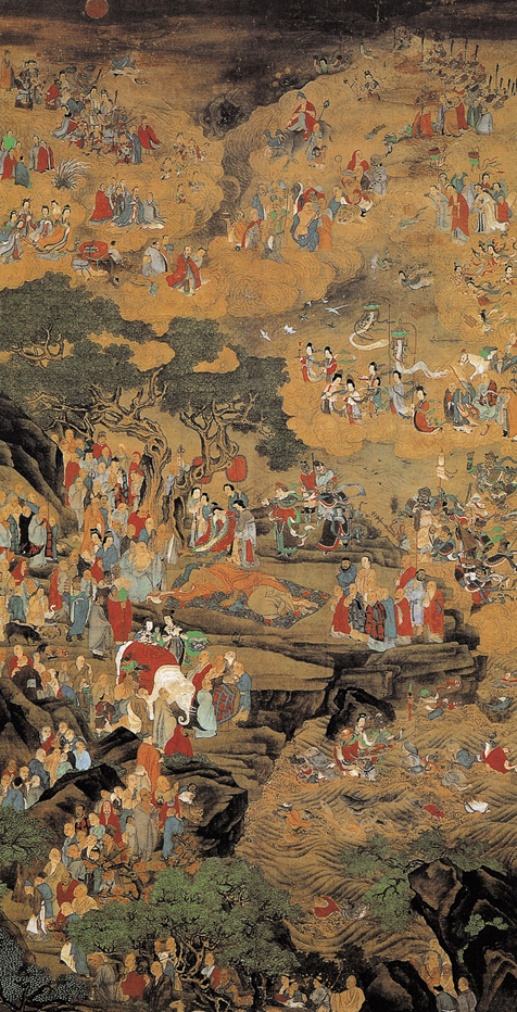 这是一幅煌煌巨制。图中佛祖侧卧于娑罗双树下圆寂涅。众多佛门弟子、道家神仙、志怪鬼异及凡界男女,纷纷前来吊唁。神情或悲恸,或穆然,或惊诧,与佛祖平和安详的神态形成鲜明对比。构图以佛祖为中心,人物动势呈放射状,布势雄伟。人物众多,神貌各异,设色浓妍。云雾卷曲的形态,为吴彬绘画的重要特色之一。