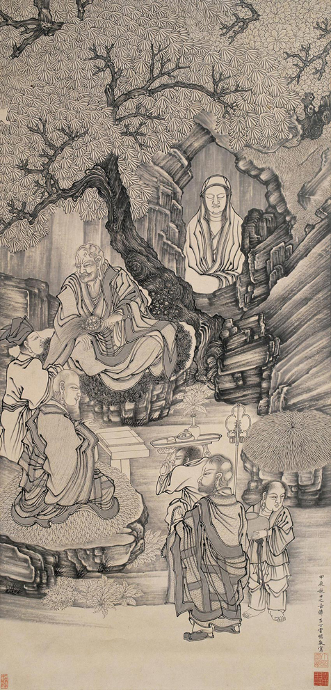 丁云鹏:(公元1547年—公元1628年),字南羽,号圣华居士,明代画家。安徽人。他擅长画人物、佛像,以精工见长,论者谓“丝发之间,而眉目意态毕现”。同时,还善画山水,花卉和写诗。董其昌赠印章“毫生馆”,逢其得意之作,便用。曾为名墨工程君房、方于鲁画墨模,《程氏墨苑》、《方氏墨谱》中的图绘,大半出其手笔。传世作品有:《待朝图》轴,辑入《中国绘画史图录》下册;《伏虎尊者》轴,现藏安徽省博物馆;《白马驮经图》轴,原藏故宫博物院,现在台湾省;《洗象图》轴,藏中国美术馆;《罗浮花月图》轴,藏上海博物馆;《龙王拜观音图》卷,藏美国纳尔逊美术馆。