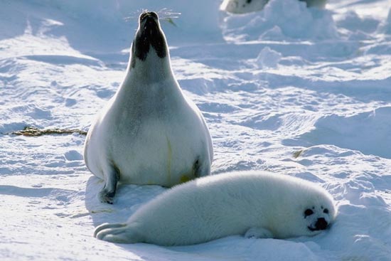 一眼望去,冰面上有上百只琴海豹在自由自在地尽情享受着生活。刚刚来到这个世界的小海豹,有的仍带着嫩黄色的胎毛,在母亲的爱抚下尽情地享受着乳汁的甜蜜和阳光的温暖。黑灰色的公海豹大多拖着肥胖的身体在懒洋洋地晒太阳。有的海豹母亲在哺乳,有的则在冰下的海水里忙碌地捕食。
