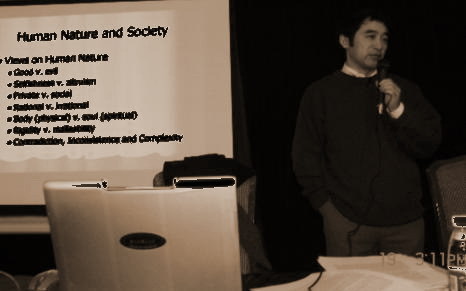 先生中等个子,给我们上课那阵子才42岁。他和我们围着那张长圆桌坐着,主导讨论的课堂过程。先生总是微笑,几乎没见过他不笑的时候,是的,他总是微笑。先生黑黑的头发是自然卷的,瘦长方脸,鼻翼两边的法令线很深,从相学角度看,显然是一个阅历丰富的人。