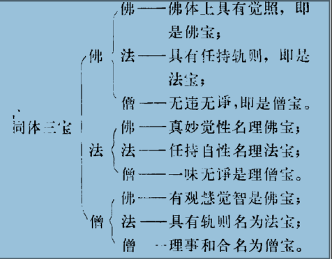 1.同体三宝,亦名一体三宝,亦名同相三宝。体即清净法界真如法身;佛性即是法性,法性即是僧性,故名同体。今就一一体上皆具有佛法僧三义显示如表: