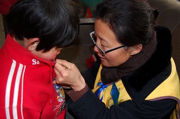 在了解了三个孩子的情况之后,仁爱的哥哥姐姐们专门为他们编织了传递爱心的蓝丝带,由鲁老师亲自给他们戴在身上,并一一地亲吻他们,他们都紧紧拥在鲁老师怀里,还像找到了失散许久的妈妈一般。在那一刹那,几个孩子都哭了。我那颗沉睡已久的心也潮湿了,心灵上的滋润与关爱此刻化为一首爱的心曲。