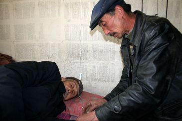 老人的一瓶点滴打完了,儿子熟练地充当“赤脚医生”给老父亲换药瓶。我们问他:“您父亲还有一个儿子呢,就这样跟着您可以吗?”