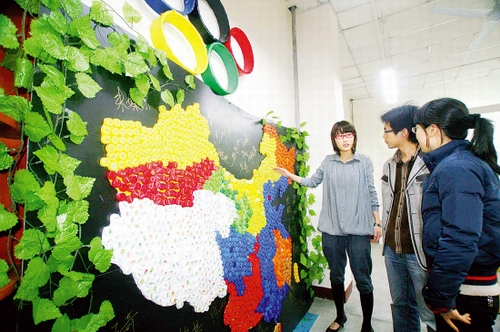 浙江林学院天目学院装饰设计061班的29名同学花了近一周时间,制作完成一幅“中国生态地图”,这幅地图共耗用2008个废弃饮料瓶盖,不同的颜色分别代表不同地区的生态绿化情况。他们希望用这件作品向大家宣传绿色奥运,表达大学生对北京奥运的支持和祝福。