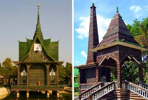 泰国西萨菊省Wat Pa Maha Chedi Kaew寺庙是由超过100万个回收的绿色和棕色啤酒瓶建造的,聪明的僧侣这样做是一举两得,他们回收利用这些丢弃的啤酒瓶,治理了当地的环境污染;此外,他们还利用啤酒瓶廉价地建造了自己的寺庙。从寺庙的水塔至游客的洗手间,都是用喜力牌和象牌啤酒瓶建造。