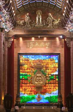 廊厅的尽头就是华藏世界。这幅面积100平方米的“华藏世界图”,以琉璃为主材质,配有大量珍贵的猫眼石、翡翠、岫玉、珊瑚、黄金、水晶等,经特殊工艺,熔铸为火焰、群山、海洋、祥云、莲花、动物、植物、佛殿、菩萨等形象,构成美丽庄严的图景。正中的金色大莲花上,端坐着主佛毗卢遮那佛,与周边的四方佛一道,形成五方五佛的大圆满格局。