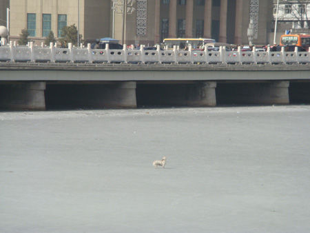 河北张家口市清水河解放桥附近的冰面上,几天来,一只小狗不停地在上面跑来跑去,不断发出悲惨的叫声,但一直无法从周边已经融化的冰面爬上岸。到昨天(