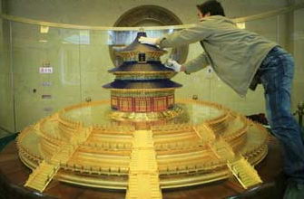 珠宝“天坛祈年殿”以“北京天坛祈年殿”为创作原型,以50:1的比例微缩,以白银、宝石、玉石,辅以铂金、钻石为主要原料(这件作品用宝石20万粒),采用传统制作工艺(花丝、錾刻、点蓝、琢玉、错金)与现代首饰制作工艺(熔模、铸造、电铸、精密雕刻、现代镶嵌技术)相结合的方法,真实再现了原祈年殿的每一片瓦、每一扇门、每一扇窗、每一根柱、每一个部件,并按实际原色、原样镶嵌各色优质宝石,艺术地、真实地再现了祈年殿的辉煌。珠宝“天坛祈年殿”是一件既具东方传统文化特色,又与现代文明相融合的传世作品;既是当今世界上罕见的工艺美术艺术珍品,也是当代工艺美术界最高水平的展示。世界佛教论坛期间,所有参会人员将有缘目睹观赏这一稀世珍宝。