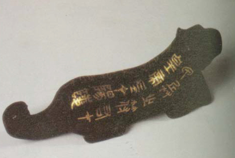 虎符高三.一四厘米,长八.九厘米,相传山东省临城出土,现藏中国国家博物馆。“虎符”为古代帝王调动军队之信和物。授予地方官吏或者统兵将领以兵权,既以虎符的左半授予,待要调动军队时,即派使臣持虎符的右前往驻地。地方官吏或统兵将领两半虎符对合,验明无误,即应发兵。虎符盛行於战国、秦、汉。此件为秦代之物。虎颈至胯间左右各有错金篆书铭文两行十二字,书曰:“甲兵之符,右才(在)皇帝,左才(在)阳陵”。阳陵为秦之郡名,即今陕西高陵县。此件铜质,为秦始皇授予驻守阳陵将领之虎符。此件因年代已久,对合处生锈,现左右不能分开,整体形成一艺术品。伏虎卧地,昂首前视曲尾上翘。虎符字体谨严浑厚,风格端庄,笔法圆转。