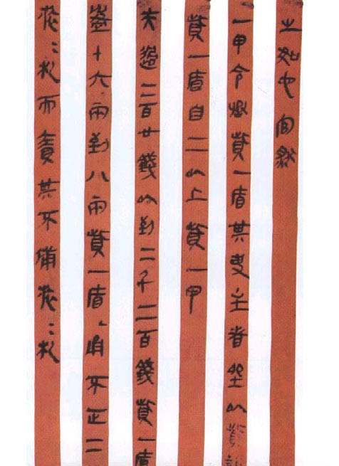 《云梦睡虎地秦简》,成书于战国晚期至秦统一初期。从简中可以看出其脱胎于秦篆,形体中仍保存有大量的母体痕迹,篆隶混杂,秦隶在破坏、肢解秦篆的书写方式中,欹斜相依,肥瘦相间,节奏鲜明平稳,笔划饱满生动,气势连贯,形成质朴而秀朗的书风。