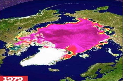 1979年的卫星照片显示,用粉色标注的北极冰层与加拿大北部(在左边)和俄罗斯(在右边)相联。