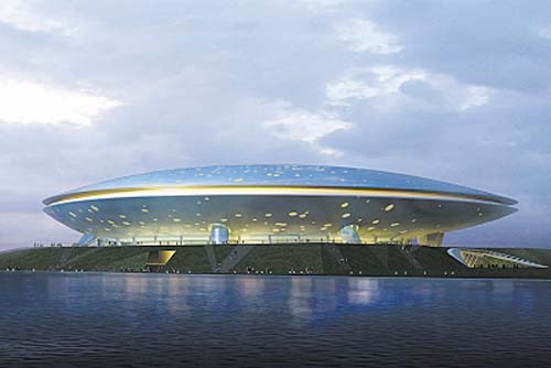 演艺中心的造型呈飞碟状,在不同角度与不同时间会呈现出不同景观。中心总建筑面积12万平方米、24小时持续运营、360°多功能场馆、每年250场演出、音乐俱乐部、电影俱乐部、文化娱乐集聚区,2010年的世博演艺中心无疑将成为上海全新的时尚文化地标。