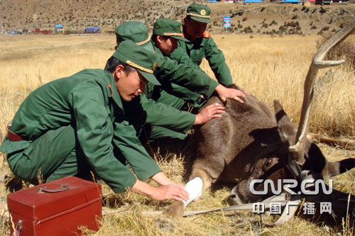 西藏森林总队不断拓展职能使命,积极协助公安机关打击偷猎藏羚羊等破坏高原生态安全的犯罪行为。在每年的3、4月份藏羚羊产绒期,总队都要派出小分队进驻羌塘自然保护区,在海拔5000多米的雪那、玛依等藏羚羊活动的核心区实施保护行动。2002年8月,总队与西藏森林公安在国家林业局的统一领导下,联合行动,重拳出击——一场代号为“高原二号行动”的专项打击非法捕杀国家一级保护动物藏羚羊的行动,在羌塘国家级自然保护区及周边地区全面展开。官兵们与森林公安一道,在冰天雪地、氧气奇缺、风沙漫卷的茫茫藏北无人区,克服了一个又一个常人难以想象的困难,历时 27天,途经10县、13乡、深入玛依、雪那、玛曲、卢玛江那四个保护站,累计行程15000多公里,有效地震慑了违法犯罪分子,保护了国家野生动物资源。先后救助受伤藏羚羊30多只,抓获偷猎分子7人,收缴猎枪7支、藏羚羊角40多对。总队所属各支队配合各个地区林业公安,在全区范围内开展“春雷行动”,查获非法购买四脚蛇200余只、熊掌8只、鹿茸3公斤,清理非法贩卖野生动物市场30余处,有力地打击了乱捕滥猎和非法购卖野生动物行为。6年来,官兵们同驻地农牧民签订野生动物保护责任书1万多份,发放“保护动物,关爱生命”等宣传画册4000余份,深入农牧区教育群众1.6万多人(次)。配合林业部门制止严惩违法作业事件187起,依法没收非法捕猎工具200余件。