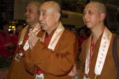 为展现东道主诚意,国际佛光会世界总会会长星云长老前往机场,亲自迎接与会代表们。“阿弥陀佛!”11时整,第一架“佛教直航”包机降落在停机坪。本次赴台高僧、学者云集,包括共同主办的中国佛教协会会长一诚长老、香港佛教联合会会长觉光长老等,其他还有来自孟加拉国、英国、南韩、意大利、日本、马来西亚、新加坡、斯里兰卡、泰国等五十个国家地区的佛教领袖。另外,中华宗教文化交流协会会长叶小文、江苏省政协主席张连珍以及首次访台的香港政府官员曾德成则备受媒体瞩目。