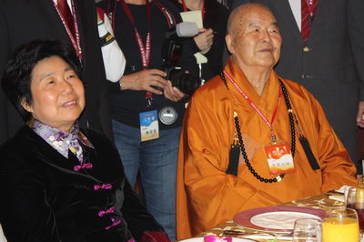 星云长老(右座)吁佛教教派彼此合作。左為第二届世界佛教论坛江苏组委会主席张连珍女士。
