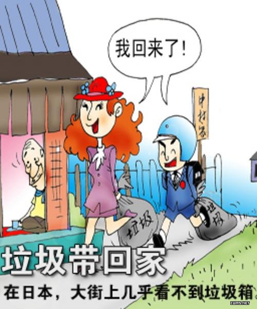 垃圾带回家。在日本,街道都是一尘不染,没有一点垃圾,但又看不见清洁工人的身影。除了自动售货机旁会设置一些供丢弃饮料瓶、罐的专用垃圾箱外,大街上几乎看不到垃圾箱。
