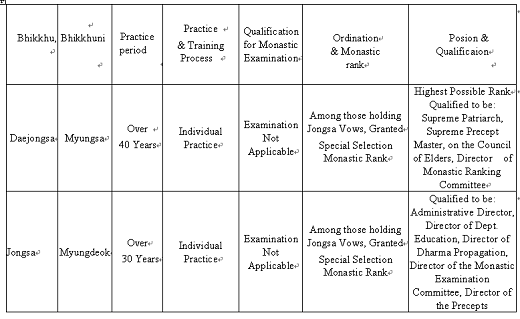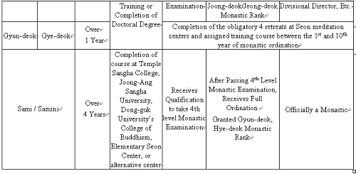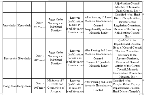 According to the ordination age, the Jogye Order monastic must complete the corresponding training. After the training, the monastic takes the examination. After passing the examination, the monastic is endowed with the corresponding monastic rank. The following chart illustrates the monastic ranking system: