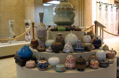 “炉香乍热,法界蒙熏,诸佛海会悉遥闻,随处结祥云,诚意方殷,诸佛现全身,南无香云盖菩萨摩诃萨。”在“宝光妙证·陶瓷艺术展”中,一套99件器型不同、釉色不同的《香云宝山》,表达出心香与炉香互相交融献于诸佛菩萨的美好心愿。为表达对此次佛教论坛的的祝福与纪念,景德镇陶瓷艺师专门创制纪念礼器《香云宝炉•六和大愿》:人心和善、家庭和谐、人际和顺、社会和谐、文明和谐、世界和平,表达佛法对和谐社会、和谐世界的护持,表达全体佛教徒和合众缘的高尚德愿。