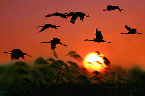丹顶鹤每年要在繁殖地和越冬地之间进行迁徙,只有在日本北海道是当地的留鸟,不进行迁徙,这可能与冬季当地人有组织的投喂食物,食物来源充足有关。