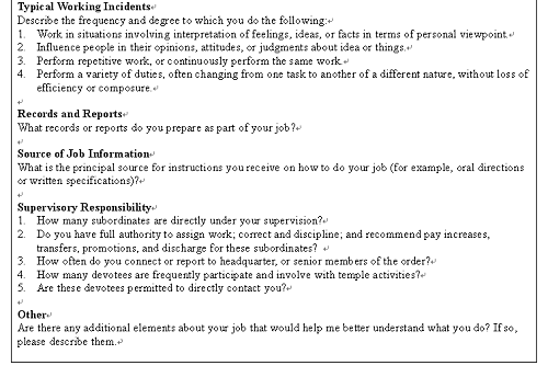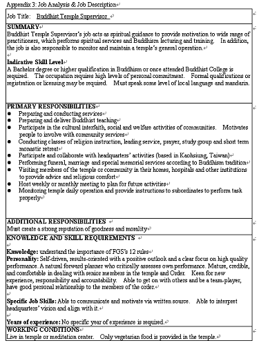 Nevertheless, if FGS wants to find a temple supervisor, middle manager with a little more experience than others, from a large employee pool, it is wise to establish a standard measurement tool for the equity and systematic purposes. In order to do that, a thorough job analysis and a precise job description together with a recruitment procedure and selection criteria should be initiated prior look into large employee pool. As job analysis has increased its status and popularity in HR practice, according to several researches, it described job-analysis should included task and general work activity (Dierdorff & Wilson, 2003); moreover, Cunningham, Drewes, and Powell (1995) stated that such analysis should be applicable to range of vocation. The data of job-analysis are often generated from three groups 1) incumbents, 2) analyst, and 3) technical experts. However, sometimes technical experts could be considered as incumbents (Dierdorff et al, 2003). Since there are no previous temple supervisor’s job description and only one relevant information found through internet, therefore, the data collection for Supervisor of Buddhist Temple are from two sources, incumbents and analyst. Analyst refers to non-job-holder’s professional insight; the analyst here is a view from the founder of FGS, Master Hsing Yun and his expectation to temple supervisor’s competency. He stated The Twelve Rules for Foguangshan monastic life (See Appendix 1) in 1995 which supervisors as a middle manager’s position should pay extra attention to these rules. This source is the most important knowledge for supervisors, because the image and action they presented to Buddhist devotees have a great impact on the success of Buddhism propagation. Moreover, a questionnaire (See Appendix 2) was distributed to 5 supervisors (incumbents) who have sound experience and expertise on their job.