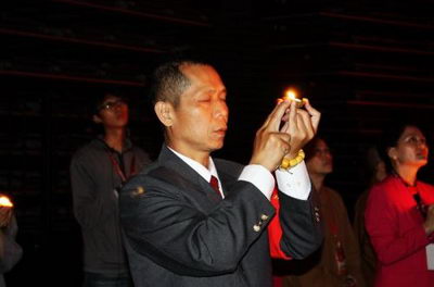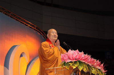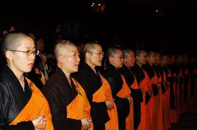 全场三万信众双手合掌,一同唱诵《般若波罗蜜多心经》,接着吟唱赞佛偈、念佛。在声声“南无释迦牟尼佛”中,会场灯光转暗,与会贵宾、代表、信众皆点燃手中烛光,霎时间,点点烛光照亮全场,场面壮观、感人。