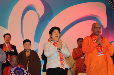 随即,大会介绍台上48位贵宾,除前述主办单位代表,还包括:江苏省主委会主席张连珍、香港民政局长曾德成、澳门佛教总会理事长健钊长老,与中国佛教协会副会长学诚法师、净慧法师、嘉木样.洛桑久美等;台湾协办单位代表国际佛光会中华总会长心定和尚、佛光山寺宗长心培和尚、法鼓山住持果东法师、华梵大学董事长修慈法师、慈济基金会发言人何日生、灵鹫山佛教教团开山和尚心道法师等;还有来自英国的阿贡仁波切、联合国世界和平基金会创立者兼主席刚坚活佛、挪威佛教联盟主席伊基尔.罗斯(Egil Lothe)、日中友好宗教者恳话会会长持田贯宣、韩国天台宗总务院长正山法师,以及马来西亚、斯里兰卡、柬埔寨、孟加拉国、越南、印度、尼泊尔等国家地区的贵宾。台下坐着逾五十国家地区佛教界领袖、上千位代表千名代表,他们来自世界五大洲,甚至有自伊拉克与北朝鲜代表参加。